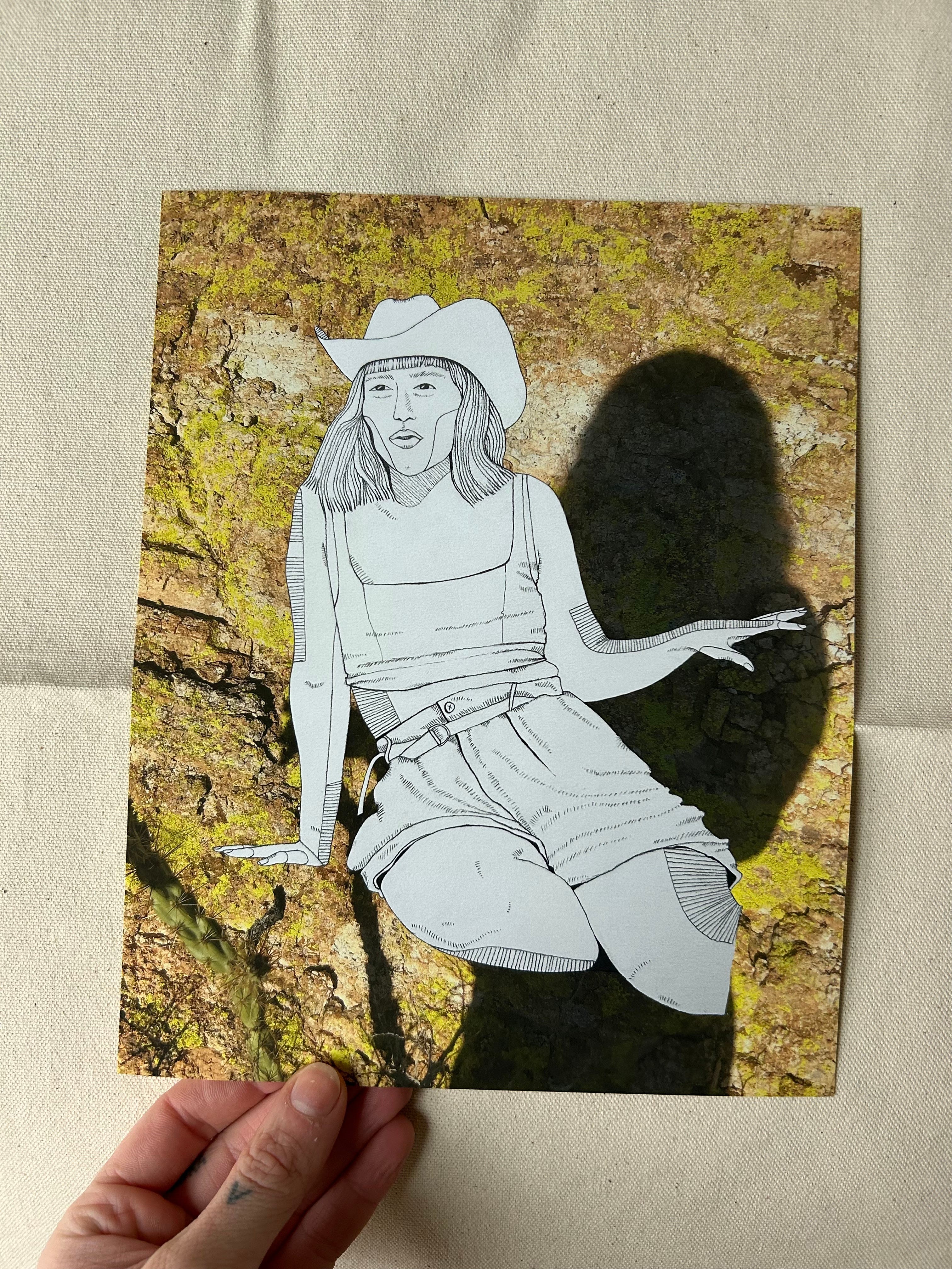 This next one i’m just about to post in the shop, so you’re all technically the first to see it! This is a new version of the original sketch i previously shared called Sign of a Cowgirl. I’m playing around with adding my travel photos to my art and i really love the way this lichen image (featuring my very own shadow), taken in a canyon in Arizona this past year looks with it.